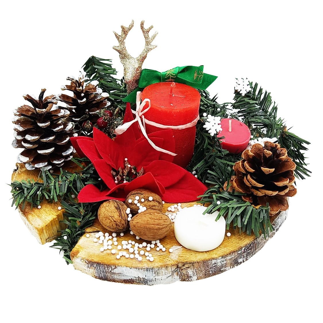 \nDecorul este conceput intr-un stil rustic si natural, cu conuri de brad, crengute si o mica craciunita. Acest design aduce un strop de farmec rural si aminteste de Craciunul traditional petrecut in mijlocul naturii.