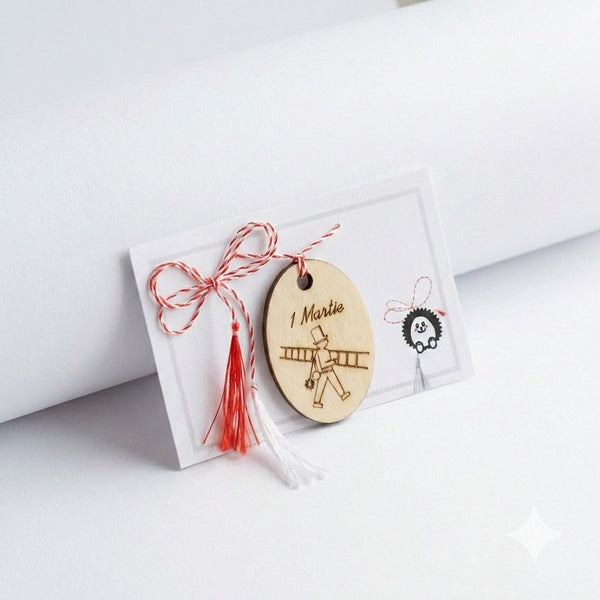 Întâmpină primăvara cu un simbol autentic al norocului! Acest mărțișor din lemn gravat aduce în prim-plan silueta clasică a coșarului, despre care tradiția spune că poartă noroc oricui îi iese în cale la început de martie.